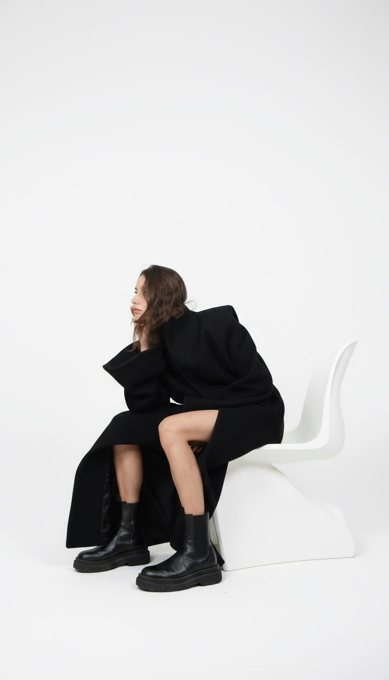 Cappotto in lana unisex, foderato, ampio e lungo.